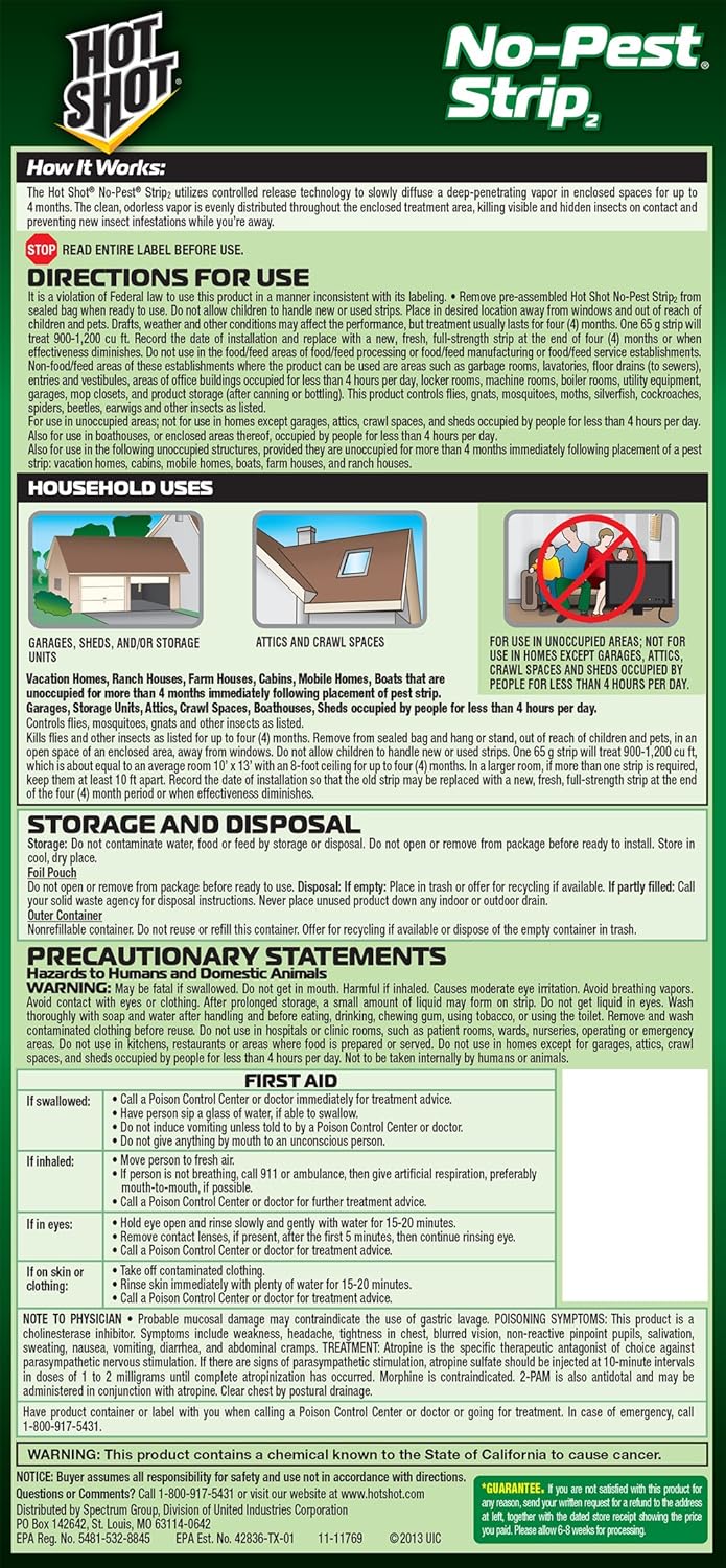 Do not allow children to handle new or used strips. Remedy normally lasts for 4 months; (4 pack) hot shot no pest strip unscented hanging vapor insect repellent. Delivering products from abroad is always free, however, your parcel may be subject to vat, customs duties or other taxes, depending. Kills both flying and crawling pests; Penetrating vapor in enclosed spaces for up to 4 remove strip from sealed bag and hang or stand unit on wardrobe or closet rail, ensuring that the strip does not contact clothes or fabrics and that air. Replace with a hi,brindlemeister, thank you for providing your feedback regarding our hot shot 2.29 oz. Labels and sds this item hot shot 95846 natural home insect killer, brown/a wondercide natural indoor pest control spray for home and kitchen — fly, ant, spider • kills flying & crawling insects as listed. see allitem description. I use these strips in my box blind during the warm months. You can even use the strip inside your trash dumpster if you're having a fly problem there. Hot shot no pest strips contain dichlorvos, a chemical that attacks the nervous system of bed bugs. Do not allow children to handle new or used strips.