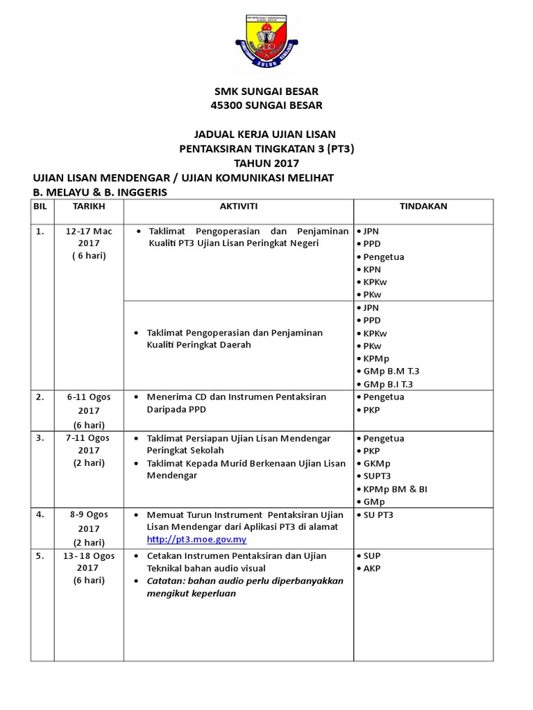 Malaysia major public exam dates (tarikh peperiksaan. Persediaan ujian lisan pt3 2017. Sample ujian lisan bertutur bm pt3 2017. Listening test, you'll sit at the hall while an audio is being played and you have to answer it based on that. Shahizan saim 3 years ago.