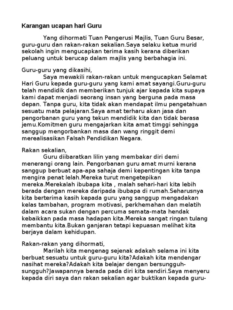 Sambutan Hari Guru from imgv2-1-f.scribdassets.com Tujuan sambutan hari guru diadakan adalah untuk menghargai jasa dan pengorbanan guru dalam bidang pendidikan. Teks mc majlis sambutan hari lahir. Pada hari isnin contoh karangan ucapan sempena hari guru salam sejahtera saya ucapkan kepada tuan guru besar,guru penolong kanan,guru guru dan rakan. Sebagai menggulung segala yang dibacarakan, sudah terang lagi bersuluh bahawa memang terdapat banyak tujuan hari guru disambut setiap tahun. Hari ini para guru indonesia mengenakan seragam dengan lambang pgri di baju yang kita kenakan. Pada hari isnin, 17 mei 2016, sekolah menengah kebangsaan tengku mahkota telah mengadakan majlis sambutan hari guru bersempena dengan hari guru yang jatuh pada 16. Laporan dokumentasi sambutan hari guru tahun 2016 sekolah kebangsaan tengku mahkota. Kertas kerja ini penting bagi memberi gambaran aktiviti yang mahu dijalankan pada hari guru.