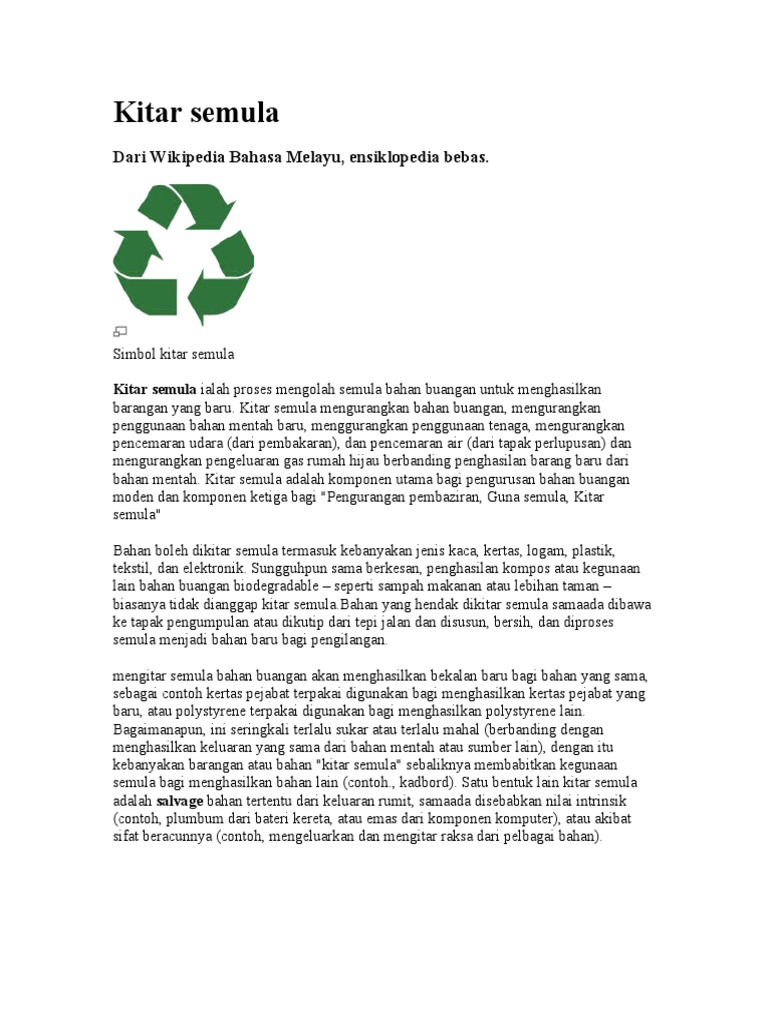 Kitar Semula from imgv2-1-f.scribdassets.com Segala bahan buangan isi rumah yang digunakan ini perlu. Kitar semula adalah proses yang menukar bahan buangan menjadi produk baru yang menambah nilai kepada kehidupan kita dan pada masa yang sama memberikan manfaat alam sekitar seperti pemuliharaan ruang tenaga, bahan dan tapak pelupusan. Jika diajukan soalan kepada masyarakat kita pada hari ini tentang apakah itu kitar semula? Bagi maksud yang lebih tepat, kitar semula ialah proses mengolah semula bahan buangan untuk menghasilkan barangan yang baru. Kerajaan sarawak bersedia meneroka semua cara untuk mengitar semula bahan buangan di negeri ini dan menjadikannya sumber nilai ekonomi. Ini dapat memelihara sumber alam semula jadi dan. Kita dapati melaka direkodkan sebagai sebuah negeri yang. Ketua menteri, datuk patinggi abang johari tun openg, berkata antaranya dengan menguruskan sisa melalui sistem kedudukan global (gps).